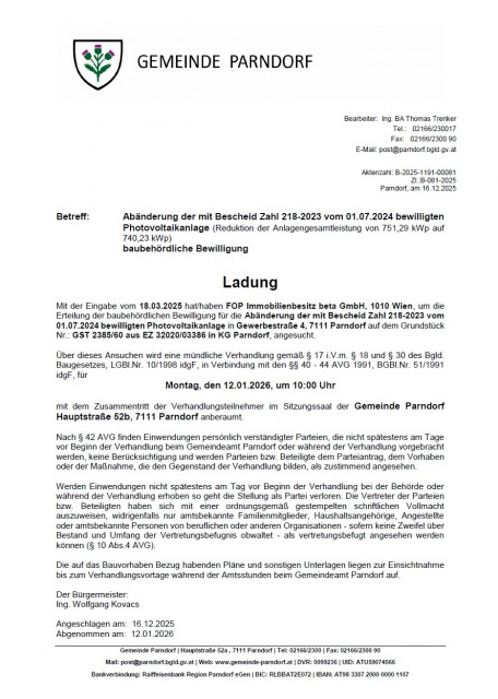 Abänderung der mit Bescheid Zahl 217-2023 vom 01.07.2024 bewilligten PV-Anlage baubehördliche Bewilligung