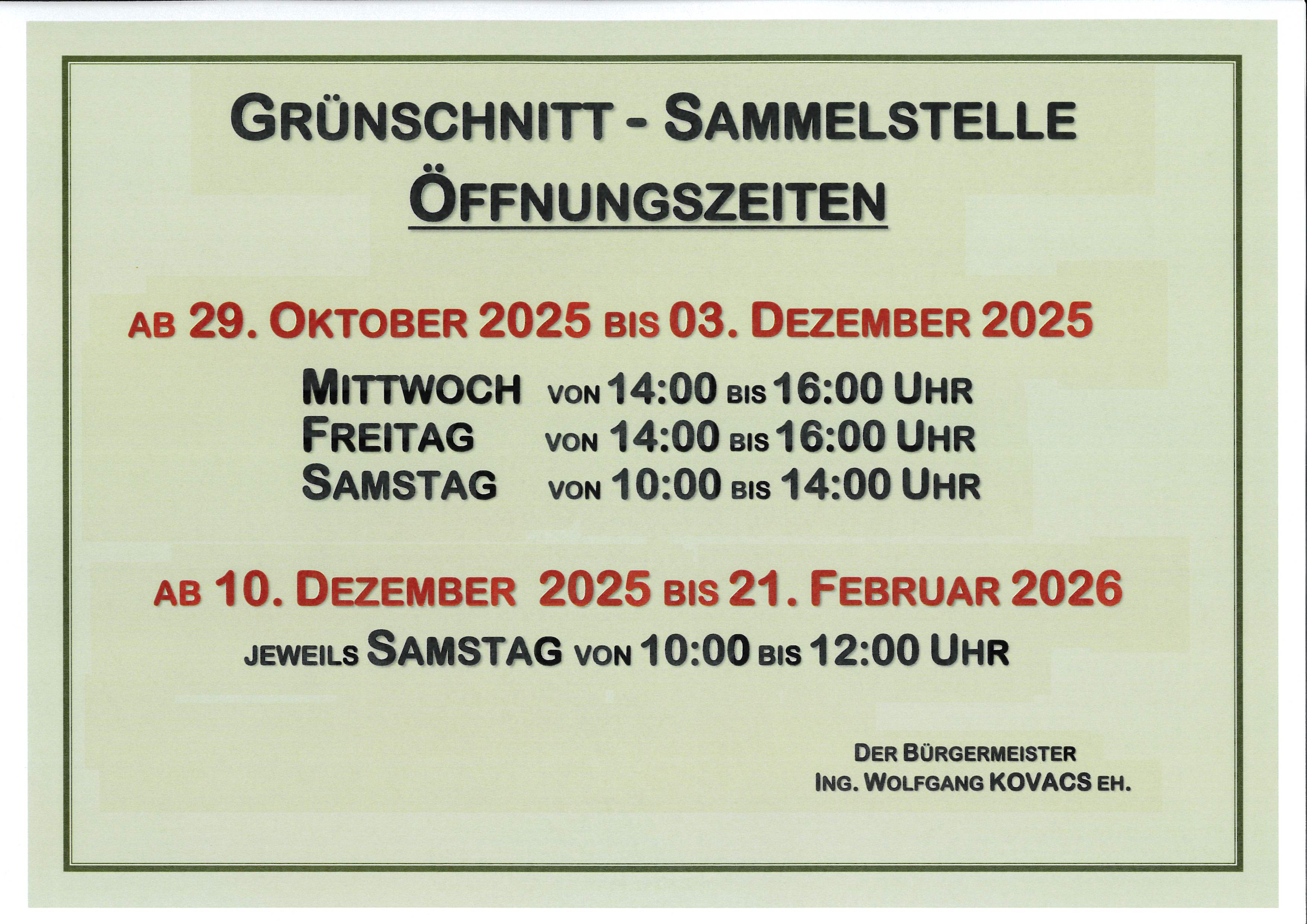 Die örtliche Grünschnittsammelstelle befindet sich in unmittelbarer Nähe des Abfallsammelzentrums. Sie bietet für die Parndorfer Bevölkerung die kostenlose Möglichkeit, Strauch-, Baum- und Rasenschnitt getrennt zu entsorgen. Es ist darauf zu achten, dass der Baumschnitt eine maximale Länge von 1,5 Metern hat.