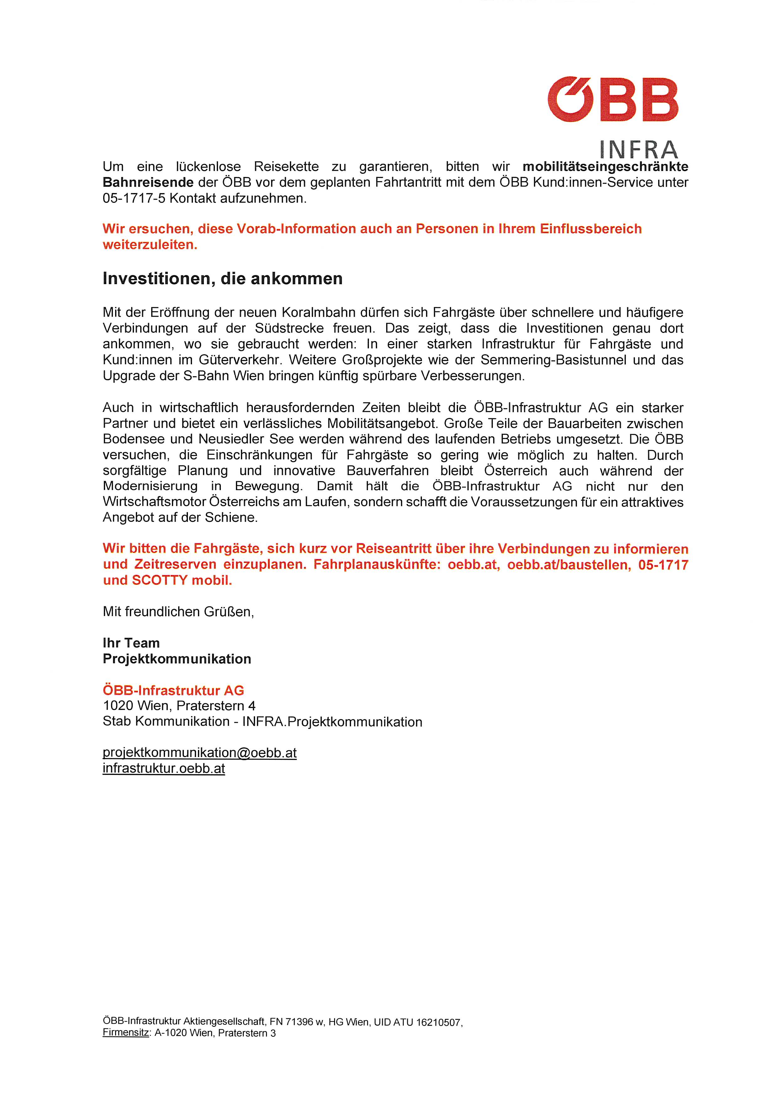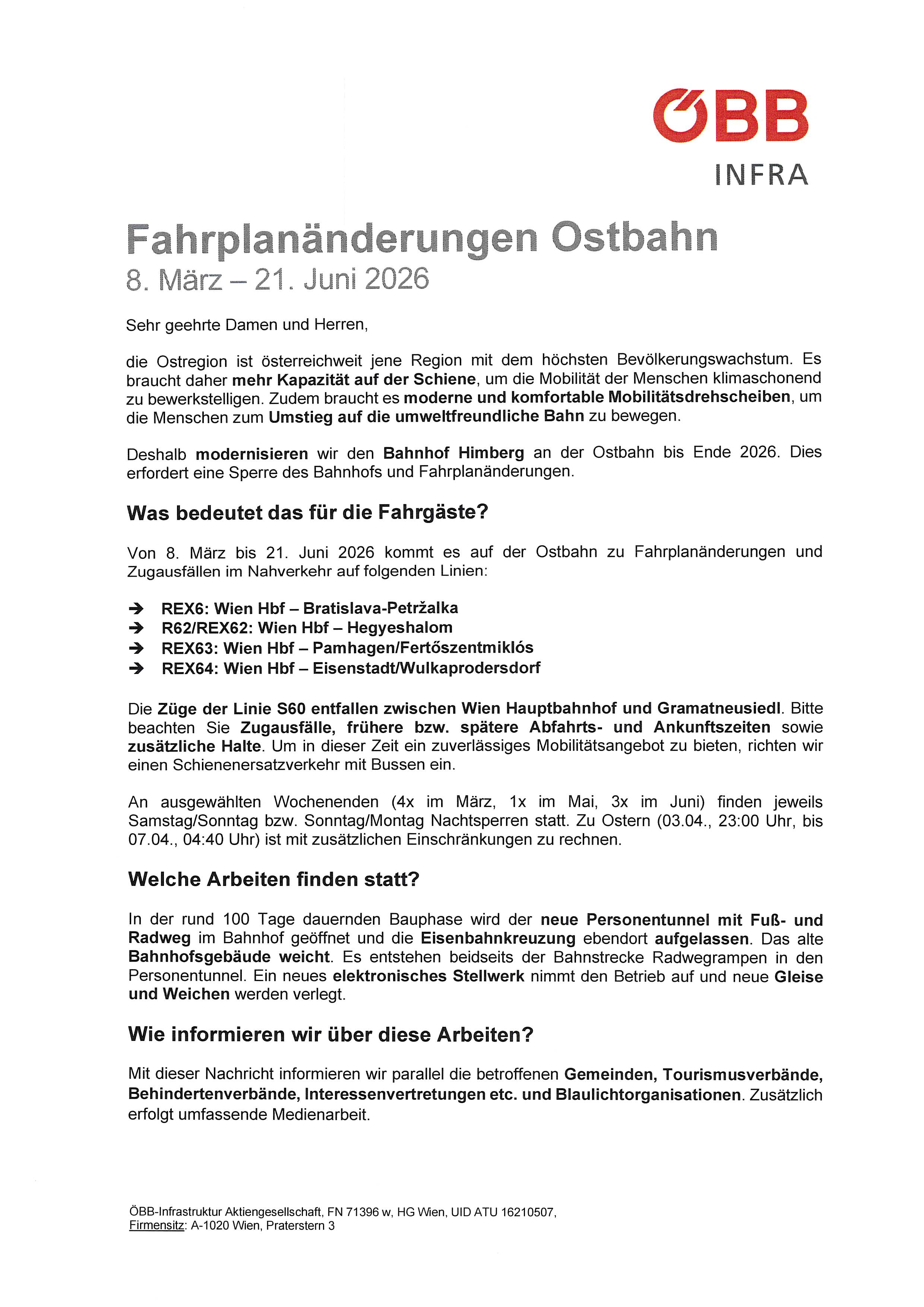 ÖBB Infra Fahrplanänderung Ostbahn, 8. März - 21. Juni 2026