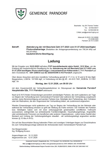 Abänderung der mit Bescheid Zahl 217-2023 vom 01.07.2024 bewilligten PV-Anlage baubehördliche Bewilligung
